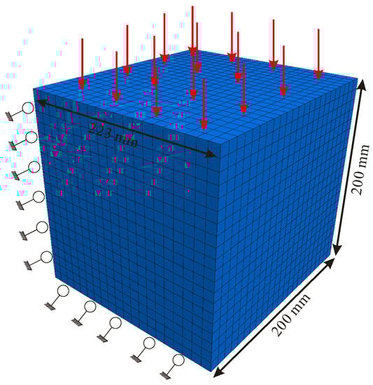 To test correctness of the secondarily developed fractional Burgers’ model, example verification was performed through numerical simulation under conditions identical to those used in the creep compression tests. The shape and dimensions of the model were the same as the specimens in the creep compression tests. Horizontal constraints were applied to as boundary conditions of four-side walls, the vertical constraint was applied to the bottom boundary, and axial stress was applied to the top boundary. The axial stresses applied in different stages were 5, 10, 15, and 20 MPa, respectively. The calculation model is shown in Figure 8.