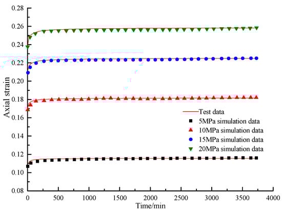 Meanwhile, the vertical displacement at monitoring points on the top of the model was monitored and recorded in the calculation process, and it was converted to the vertical strain of the model for comparison with creep curves of specimens obtained from creep compression tests (Figure 9).