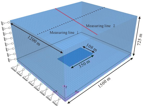 According to the specific geological conditions of the backfill panel in Tangshan Coal Mine and combined with the stratal movement characteristics, a model measuring 1500 m × 1200 mm × 725 m (length × width × height) was established. For the convenience of mesh generation, the thicknesses of the strata were rounded according to the actual conditions, and the grids of strata near the surface were refined. A total of 4,220,601 nodes and 4,140,000 elements were generated in the model. Horizontal constraints were applied to four sides of the model, the horizontal and vertical constraints were applied to the bottom boundary, and no constraint and load were applied to the top boundary. The Mohr–Coulomb model was adopted to coal, and the fractional Burgers’ model was used for the backfill. The numerical model is displayed in Figure 10.