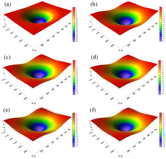 3-d surfaces for surface subsidence after different creep durations: (a) 30 d, (b) 60 d, (c) 90 d, (d) 180 d, (e) 270 d, (f) 360 d.