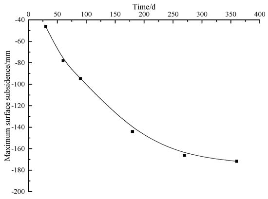 According to the simulation results for surface deformation above the backfill panel, 3-d mapping software was adopted to process the simulation data, thus obtaining 3-d surfaces representing the surface subsidence after different creep durations (Figure 11).