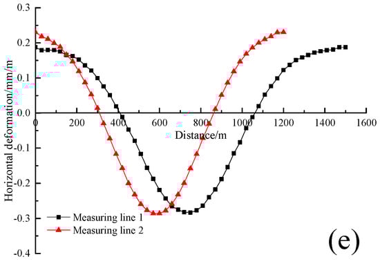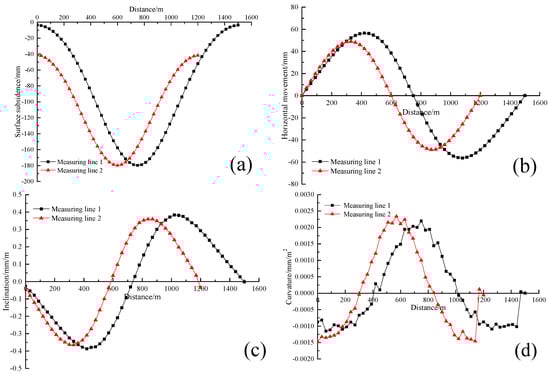 Based on definitions of surface deformation indices (subsidence, horizontal movement, inclination, curvature, and horizontal deformation), the simulation scheme with the creep duration of 360 d was used to process monitoring data from measuring lines 1 and 2 (Figure 13).