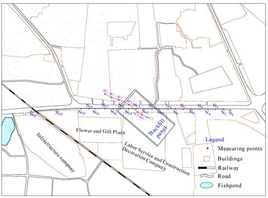 In accordance with surface conditions corresponding to the backfill panel and general trend in the mining-induced surface subsidence, two measuring lines for surface subsidence were arranged above the mining area in the test, separately along south-north direction and the direction of advance of the panel. The south-north measuring line with a length of 887 m was arranged to extend along the South Jianshe Road above the backfill panel, along which equidistant measuring points N1 to N22 were established. The measuring line along the direction of advance of the backfill panel was 218 m long and arranged above and along the backfill panel, along which equidistant points W1 to W7 were established. The layout of the measuring points is shown in Figure 14.