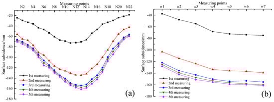 The surface deformation above the backfill panel was monitored on more than 10 occasions, and the measurement accuracy met the requirements outlined in the Code of Measurement Procedures in Coal Mines. The surface monitoring data were processed, thus attaining curves of accumulated surface subsidence along the two measuring lines, as illustrated in Figure 15.