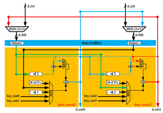 The pipelined design of the proposed data expansion block is shown in Figure 2. As we described earlier in Section 2, a plaintext to be encrypted is split into two words of and , as shown in Equation (1). Therefore, in Figure 2, we split input data into two-word sizes of and . Moreover, our data expansion block contains two 2 × 1 multiplexers (we denote with MUX) and two buffers (i.e., Rdata1 and Rdata2). The multiplexers select n-bit input data or feedback data from the combinational circuit. On the other hand, Rdata1 and Rdata2 buffers are needed to load input data simultaneously. Two blocks, highlighted with orange color in Figure 2, are responsible to process the data in terms of encryption and decryption operations. The architecture of each block implements Equation (2). It takes two key segments as inputs and results in singular data as output. For instance, takes and as input and produces as output. Similarly, takes and as input and produces as output. These blocks operate serially (one after another) to generate the resultant data. Moreover, the design of blocks consists of SHIFT (i.e., , and ), Exclusive(OR) (i.e., ⊕), and AND (i.e., ⊙) operations. The and in Figure 2 means the 5-bit and 1-bit cyclic shift towards left. The # of 0’s determines the register value with all zeros. Furthermore, the multiplexers in the orange portion of Figure 3 with size are used for selecting the right signals either before or after shifting. Finally, the concatenation of the and provides the encrypted/decrypted data.