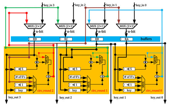 Keys for other rounds. For generating round keys, the outputs from RA, RB, RC, and RD buffers are connected as inputs to the circular blocks (i.e., , , and ). The , , and blocks are mandated to generate the round keys. The internal architecture of these circular blocks is highlighted with orange color in Figure 3. Each block contains inputs from two buffers to generate 64 bit of the resultant round key. Moreover, the circular blocks require operations such as the data expansion block to generate the round keys for SIMECK. The terms and in Figure 3 mean that a 5-bit and 1-bit circularly shift towards left. The # of 0’s determines the register value with all zeros. The multiplexers in an orange portion of Figure 3 with size select the right signals before or after shifting. Finally, the , , , and signals contain the round key for the SIMECK block cipher algorithm and these smaller keys are connected to the data block for encryption/decryption operations.
