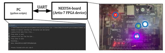 The validation setup is illustrated in Figure 7. The left side shows the processing inside the PC. In other words, the PC block in Figure 7 runs the python scripts to load/store data to/from the FPGA. The right side shows the Nexys 4 FPGA, connected to the PC. It is essential to mention that the Nexys 4 device is NIST-recommended to validate block ciphers, and it consists of an Artix-7 FPGA. The red LED on the top-right corner glows when the FPGA device is powered up. The green LED determines the type of operation (encryption/decryption) to be performed on the FPGA. The white LED blinks when the FPGA has received the data and key bits as input using UART. The right bottom pink LED glows when the required encryption/decryption operation is completed successfully. Finally, the left lower pink LED glows when the FPGA transfers encrypted/decrypted data as output using UART to PC.
