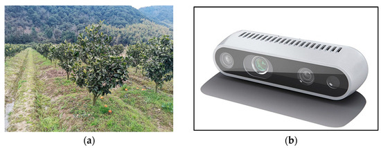 The data in this paper were collected from a citrus plantation in the Jiaojiang District of Taizhou City in the Zhejiang Province of China. The images acquired were taken from 5–8 February 2022, from 9 a.m. to 6 p.m. A total of 766 RGB-D and RGB images of citrus trees in natural environments were collected using the RealSense d435i depth camera produced by Intel with resolutions of 1280 × 720 pixels for RGB images and 848 × 480 pixels for RGB-D images saved in the portable network graphics format. The experimental scene and image acquisition equipment are shown in Figure 1. To simulate the real working environment of a citrus spraying robot as realistically as possible, citrus tree images at different light intensities correlating with morning, noon, and afternoon periods were taken at different light angles (i.e., backlight and forward light). Various backgrounds, shooting angles (e.g., front and side views), and growth periods (e.g., seedling, flourishing, and fruiting) were collected. Example images are shown in Figure 2.