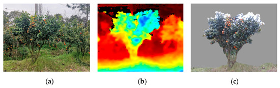 Tree crown RGB-D image generation process: (a) RGB image; (b) depth image; (c) RGB-D image.