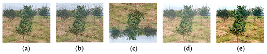 In this paper, the efficient interactive segmentation (EISeg) tool [40] was used to automatically annotate the citrus crown in the RGB and RGB-D images and generate a Common-Objects-in-Context-formatted annotation file [41]. Apart from the background items, the label categories accounted for seedling, flourishing, and fruiting crown stages. Following the image annotation, to improve model generalizability, the image data were augmented using random brightness changes, contrast enhancements, and random rotations. These methods are shown in Equations (5)–(8). Therefore, to simulate the effect of noise from everywhere in the natural environment, Gaussian noise was added to the image data, as shown in Figure 4.