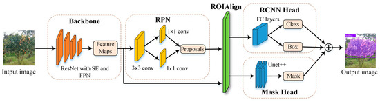 The Mask R-CNN instance segmentation model [43] introduced a fully convolutional network (FCN)-based R-CNN [44,45] to realize pixel-level multi-target detection and segmentation. Based on the Mask R-CNN, this paper proposes the improved MSEU R-CNN to accurately segment citrus tree crowns at variable growth cycles. The overall structure is shown in Figure 5. By integrating the SE block with ResNet and combining feature pyramid networks (FPNs) [46], a backbone is formed to extract the features of the input image and to output a large number of candidate frames. Hence, the region-of-interest (ROI) in which the target may exist is filtered through a region proposal network (RPN). The ROI is then input to the ROIAlign layer and mapped to a fixed dimension feature vector via bilinear interpolation. The mapped features are then input into three branches; the tree crown is classified, and the bounding box is regressed through the fully connected layer. The Unet++ network is then used for semantic segmentation to generate a high-precision tree crown mask.