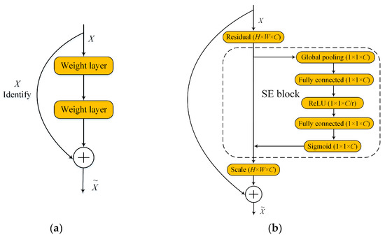 ResNet module and SE-ResNet module: (a) ResNet module; (b) SE-ResNet module.