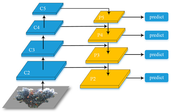 Because the crown of the seedling stage is much smaller than that of the flourishing and fruiting stages, to improve the detectability of small targets, the classic method uses the image pyramid method to enhance the multiscale changes of images during the training or testing stages, but it greatly increases the calculation effort of the image pyramid [46]. In this paper, the FPN method is adopted to avoid these problems, and it simultaneously better handles the multiscale change in object detection. The network structure is shown in Figure 7. The ResNet consists of five stages, convolutional layers taken from 1 to 5, respectively. Because the first layer of convolution (conv1) occupies a large part of memory, it is not included in the pyramid. Corresponding to conv2, conv3, conv4, and conv5, one feature map with different scales is generated, expressed as C2, C3, C4, and C5 respectively. Using the feature map of the ResNet output as input to the FPN to establish the feature pyramid, the new features are output: P2, P3, P4, and P5.