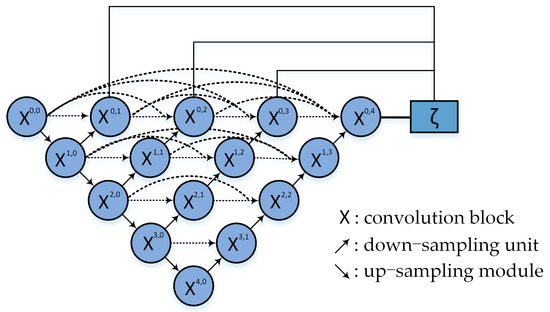The mask branch of Mask R-CNN uses an FCN to extract the semantic information of the image [43], which is sensitive to the local semantic information but neglects the context information, resulting in the loss of pixel position features of the shallow network to a certain extent during image feature transmission. To better combine the shallow and deep features of the image, The MSEU R-CNN model introduces the Unet++ to improve the model segmentation performance by replacing the original mask branches. As shown in Figure 8, the Unet++ is composed of convolution blocks, down-sampling units, and up-sampling modules with skip connections between the convolution blocks. Each node in the figure represents a convolution module that combines the feature maps of four different semantic levels and makes full use of the image features of different layers to improve model generalizability. The Unet++ then redesigns the skip path based on the Unet model and uses dense skip-layer links to fuse the multiscale features of each convolution layer to achieve denser and more flexible feature propagations. From the vertical direction, each node fuses the feature images of different resolutions from the previous node to maximize the interconnection between each feature layer. This multiscale feature fusion structure thus improves the model segmentation accuracy and convergence speed.