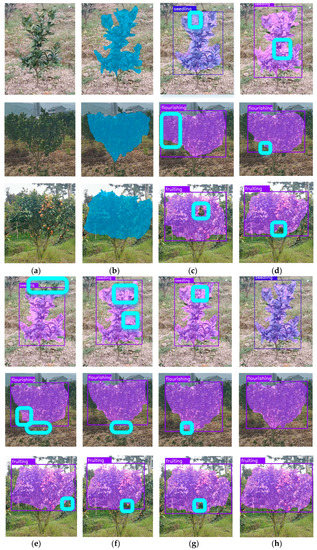 Segmentation effects of different models on Citrus tree-crown at different growth stages: (a) Original; (b) Label; (c) Model 1; (d) Model 2; (e) Model 3; (f) Model 4; (g) Model 5; (h) Model 6.