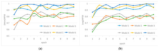 Precision-recall curves graphs during testing stage before and after Mask R-CNN optimization: (a) Model 1; (b) Model 2; (c) Model 3; (d) Model 4; (e) Model 5; (f) Model 6.