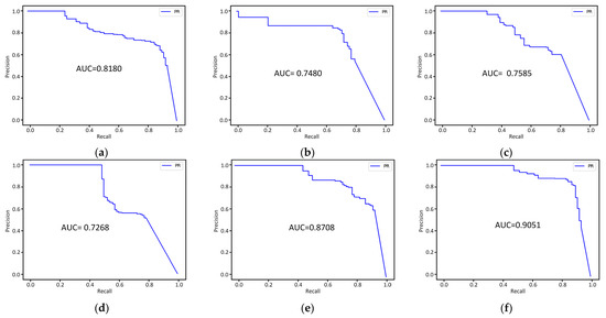 To better verify the superiority of the segmentation performance of the MSEU R-CNN model, the changes to various evaluation indices during the training of different models are drawn as curves, including one for bbox AP50, and seg AP50 (Figure 10). It can be seen from the change trend of various indicators that the evaluation indicators of the MSEU R-CNN model are better than others in training, showing faster convergence and stronger robustness. Because the model proposed in this paper uses the information fusion method of the SE block to enhance its efficacy, suppress invalid features, and fully fuse the feature map information, its feature extractability is further improved so that the accuracy converges satisfactorily. Moreover, precision–recall curves graphs of various Mask R-CNN models are presented in Figure 11. The area under the curve (AUC) value of the MSEU R-CNN model is 0.9051, which is the largest value among those of the six models, indicating that the classifier works best.