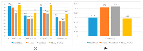 To further analyze the superiority of the MSEU R-CNN model, this paper compared it with three typical instance segmentation models: BlendMask [54], BoxInst [55], and CondInst [56]. To achieve a fair comparison, the training, verification, and testing sets of Dataset 1 were used for training and testing for all models. Figure 12 shows the performance of each model in terms of accuracy and speed. It can be seen from Figure 11 that the bbox AP50 of the MSEU R-CNN was 7.7 and 25% higher than those of BlendMask, BoxInst, and CondInst. The bbox AR was 9.2, 19.4, and 18.6%, the seg AP50 was 6.2%, 23.4%, and it was 26.3% higher. The F1-scores were 20%, 21.7%, and 24.1% higher. The results show that the proposed model had stronger feature learning ability and higher segmentation accuracy than the other three models. By analyzing the structure of MSEU R-CNN, it can be seen that the Unet++ network effectively combined the multiscale characteristics of each convolution layer and improved the segmentation accuracy to a certain extent. Compared with ResNet, the SE-ResNet paid more attention to the effective features in the image, and the feature extractability was improved. The real-time performance of the model was evaluated using the segmentation time of a single image, as shown in Figure 11. The MSEU R-CNN only took ~0.19 s to complete an instance segmentation, and the processing time was reduced by 38.7 and 41.9%, respectively, compared with BoxInst and CondInst. Because MSEU R-CNN’s residual network (SE-ResNet-18) had a shallower network layer than theirs (ResNet-50), fewer training parameters and hardware configuration were needed. Notably, the MSEU R-CNN model ran relatively fast. Moreover, Figure 13 illustrates the test results of BlendMask, BoxInst, CondInst, MSEU R-CNN, DeepLab version three (DeepLabv3) [57], and Unet on the self-defined dataset for a comparison. Because DeepLabv3 and Unet are semantic segmentation networks, they can achieve pixel-level segmentation but cannot locate the border box by instance segmentation. Further, when compared with BlendMask, BoxInst, and CondInst, MSEU R-CNN can achieve a more refined segmentation and accurate positioning. Thus, in summary, the MSEU R-CNN model proposed in this paper achieved the best model accuracy and operation efficiency compared with other models.