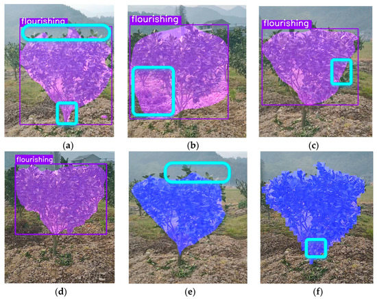 To understand the performance of the MSEU R-CNN in the tree-crown segmentation task in a variety of complex backgrounds, Dataset 1 was used for model training, and citrus crown images from three growth periods were selected for testing (i.e., 200 images: 65 seedlings, 66 flourishing, and 69 fruiting). The background of each period was complex and varied. The performance of the model varies greatly in different equipment tests. To evaluate the trained model accurately, the same hardware configuration used during training was applied. The main test equipment was a high-performance computer employing a GeForce RTX2060 GPU (6 GB), an Intel i7 9750h CPU, and an SSD (100G) mainly. The fruit trees at each stage had different shapes, which differently affected the prediction results of the instance segmentation model. The MSEU R-CNN model results are shown in Table 4.