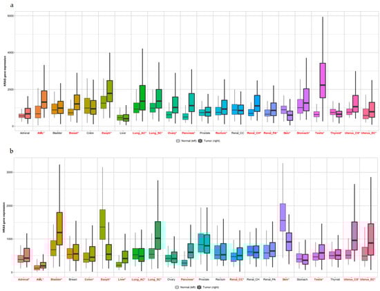 KRAS (a) and HRAS (b) pan-cancer expression (significant differences are marked with red).