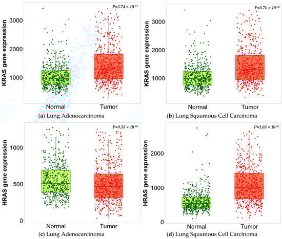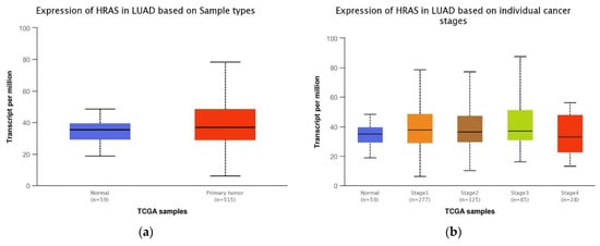 As it was shown in Figure 2c, the HRAS gene expression level in LUAD samples (n = 524) was lower than in normal tissue (n = 486), with a statistical significance of p < 0.05. On the contrary, HRAS in LUSC was overexpressed compared to non-cancerous patients (tumor n = 501, normal n = 476) and this difference was statistically significant (p < 0.05) (Figure 2d). Detailed statistical values of the above-mentioned analyses are contained in Supplementary Table S1.