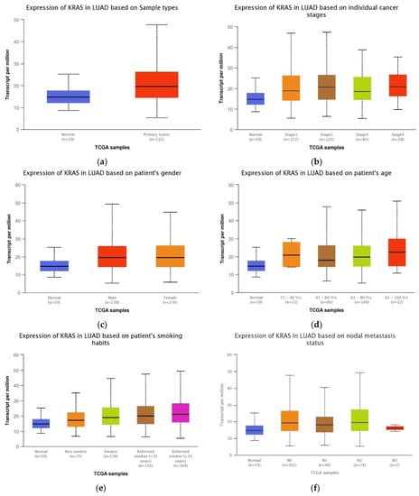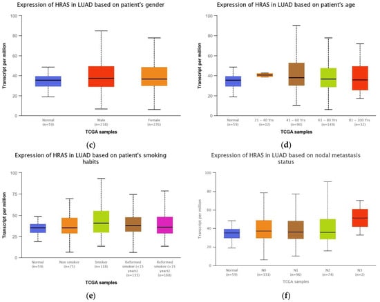 HRAS expression profile in lung adenocarcinoma. Box-whisker plots show the expression of KRAS in normal and tumor samples (a), tumor subgroups based on individual cancer stages (b), patient sex (c), age (d), smoking status (e), nodal metastasis (f) (Data derived from the UALCAN server (http://ualcan.path.uab.edu/ (accessed on 15 June 2022))).