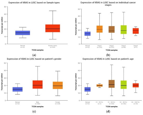 TCGA (The Cancer Genome Atlas) data available on the UALCAN portal (http://ualcan.path.uab.edu/index.html, accessed on 15 June 2022) [18] was employed to analyze the association between KRAS and HRAS expression with clinical features and demographic status, i.e., age, individual cancer stages, and smoking status in lung squamous cell carcinoma (LUSC) and adenocarcinoma (LUAD).