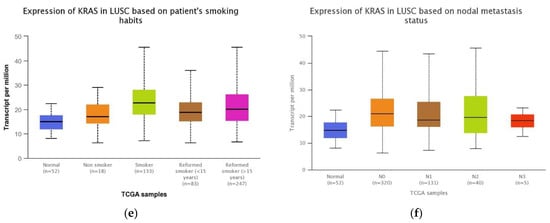 KRAS expression profile in lung squamous cell carcinoma. Box-whisker plots showing the expression of KRAS in normal and tumor samples (a), tumor subgroups based on individual cancer stages (b), patient sex (c), age (d), smoking status (e), nodal metastasis (f). (Data derived from the UALCAN server (http://ualcan.path.uab.edu/ (accessed on 15 June 2022))).