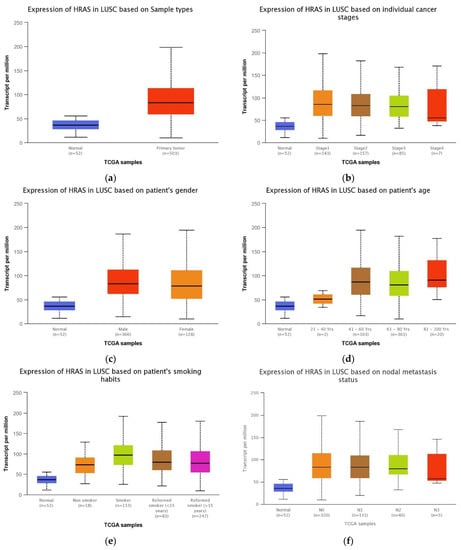 HRAS expression profile in lung squamous cell carcinoma. Box-whisker plots show the expression of KRAS in normal and tumor samples (a), tumor subgroups based on individual cancer stages (b), patient sex (c), age (d), smoking status (e), nodal metastasis (f) (Data derived from the UALCAN server (http://ualcan.path.uab.edu/ (accessed on 15 June 2022))).
