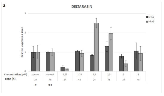 In all experimental concentrations, deltarasin slightly increased KRAS expression after 48 h compared to cells incubated for 24 h (Figure 7a). Deltarasin 2.5 μM treatment reduced HRAS mRNA expression levels in NSCLC cell line A549 after 48 h incubation in comparison with 24 h. In all samples, KRAS mRNA expression levels were higher than HRAS with the exception of 24 h and 48 h incubation with 2.5 μM deltarasin.