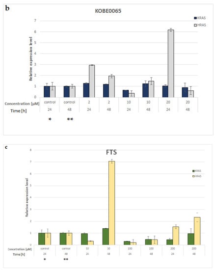 FTS treatment, at all concentrations, resulted in higher KRAS mRNA expression after 48 h than 24 h (Figure 7c). Stimulation with 50 μM FTS caused stronger HRAS mRNA expression after 48h incubation. For 200 μM treatment, HRAS expression was higher after 48-h incubation than after 24 h.