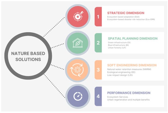 NbS is a new concept that started to be used at the beginning of the 21st century and was later adopted by several global institutions []. NbS has evolved as an “umbrella” concept [,] that incorporates several existing concepts and practices [] that can be applied to the strategic dimension, spatial planning dimension, soft engineering dimension, and performance dimension (Figure 1) []. The most recent EC report on NbS states that this concept embodies new ways of approaching socioecological adaptation and resilience, with equal confidence in the social, environmental, and economic domains [].