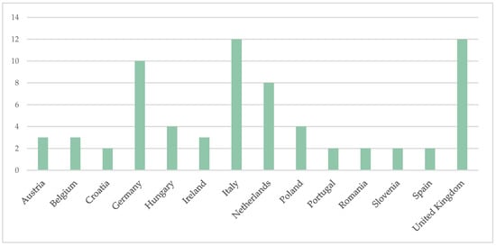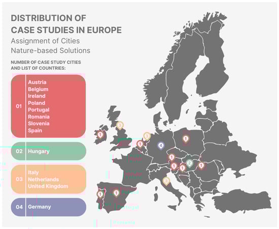 As the focus of the research—current initiatives to implement NbS in urban areas in the European panorama—it was possible to analyse case studies in the following cities: Amsterdam (The Netherlands), Bari (Italy), Berlin (Germany), Bilbao (Spain), Bristol (United Kingdom), Budapest (Hungary), Dresden (Germany), Dublin (Ireland), Dortmund (Germany), Edinburgh (United Kingdom), Genk (Belgium), Hamburg (Germany), Linz (Austria), Lisbon (Portugal), Ljubljana (Slovenia), London (United Kingdom), Milan (Italy), Oradea (Romania), Poznan (Poland), Rotterdam (The Netherlands), Szeged (Hungary), Turin (Italy), Utrecht (The Netherlands), and Zagreb (Croatia). The first step was to analyse the country of origin of each study (Figure 2). The colours in Figure 2 indicate the countries and the respective number of cities analysed. The most representative country was Germany, with four cities, followed by Italy, The Netherlands, and the United Kingdom, with three cities each, and Hungary, with two cities. The remaining countries include only one city under study.