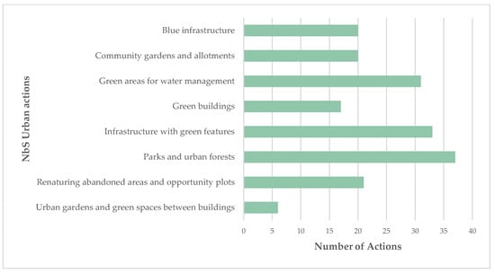 During the second stage of the research (consultation of the “Scopus” and “Web of Science” databases), a considerable number of cities were not addressed and cited in published articles on NbS under penalty of the exclusion and eligibility criteria previously defined in the Methodology section. Thus, it was not possible to find articles that contained relevant information for the analysis of NbS actions in the following cities: Bari, Bilbao, Bristol, Budapest, Dortmund, Dresden, Edinburgh, Linz, Oradea, and Zagreb. The rest of the documents were important for classifying the different NbS actions, their benefits, and ecosystem services associated with the urban environment.