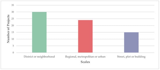 Figure 5 represents the spatial distribution of NbS implementation scales in urban space. Analysis shows that the NbS implemented on the “district or neighbourhood” scale correspond to 43% of the total sample, followed by “regional, metropolitan, or urban” and “street, plot, or building”, representing 35% and 22%, respectively.