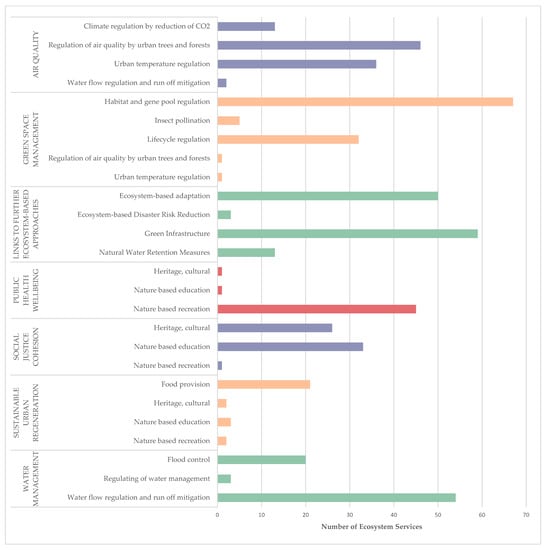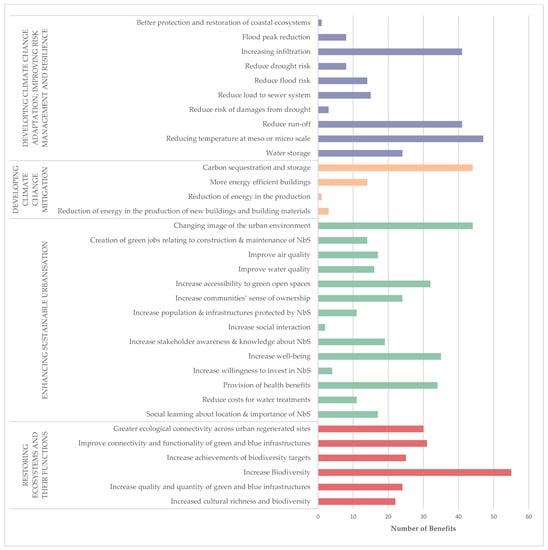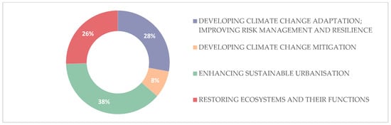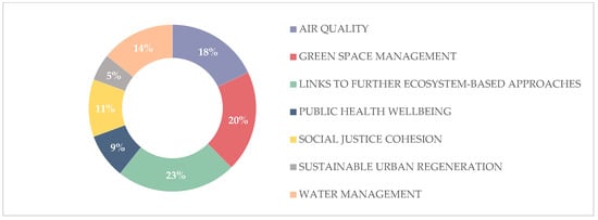 From the classification of different urban ecosystem services and multiple benefits in the implementation of NbS actions, according to which 69 projects were analysed, it was possible to compile the data and represent them through Figure 6, Figure 7, Figure 8 and Figure 9.