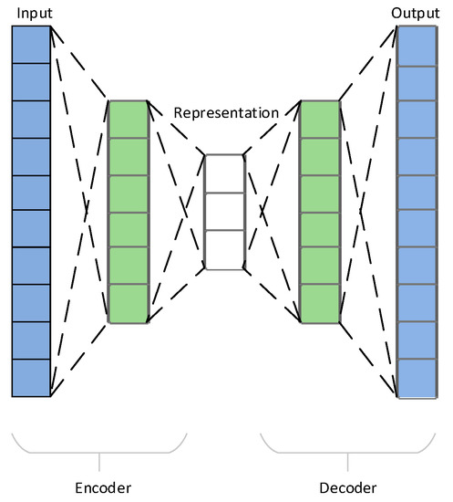 Autoencoder (AE) is an artificial neural network to realize data representation learning. At first, AE was studied to solve the “encoder problem” in representation learning. In 1985, David H. Ackley, Geoffrey E. Hinton and Terrence J. Sejnowski first tried the AE algorithm on the Boltzmann machine. Its effect of representation learning was discussed [18]. After the backpropagation (BP) was proposed, AE was studied as one of the implementations of BP [19]. Until 1987, AE was formally proposed in a study by Yann LeCun [20]. In the research, an AE was constructed by MLP to reduce data noise. In addition, the research on data dimensionality reduction using MLP AE also received attention [21]. The schematic of AE is shown in Figure 1.