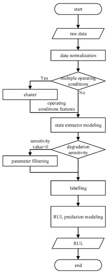 To further improve the overall application efficiency, a novel process of the RUL prediction is introduced. A state detector is built for automatic data filtering and labelling. Besides, for multiple operating conditions, new features are extracted and added by clustering. The diagram of the complete RUL estimation algorithm is displayed in Figure 5.