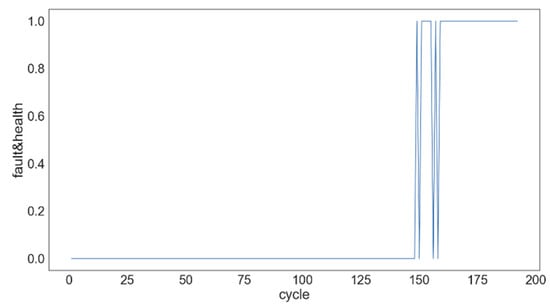 The first 30 healthy cycles for each engine were denoted as 0, and the final 30 degraded cycles were 1. Then, ExtraTreesClassifier was trained as a state detector. Taking engine 1 in FD001 as an example, as shown in Figure 9, the whole life of the engine was 192. The failure began to manifest at the 149 cycle. Then, the state of the engine 1 fluctuated frequently until about the 159 cycle and finally degraded. The result also confirms the effectiveness of Heimes’ assumption.