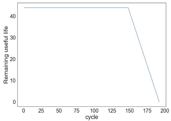 Due to the lack of a physical degradation model, it is difficult to determine the expected RUL corresponding to the running cycle. This is especially true for a complex aero-engine system. According to Heimes’ assumption, a new engine performs normally in the early stage. When the initial failure occurs, the system will linearly deteriorate. Based on the above theory, the RUL could be labelled with a piecewise linear function. The state detector determines the different engine life stages. For the early healthy state, it is labelled by the real RUL; for the fault state, it is regarded as linearly decrement with the slope of −1. Hence, for engine 1 in FD001, the visualization result of the RUL is shown in Figure 10.