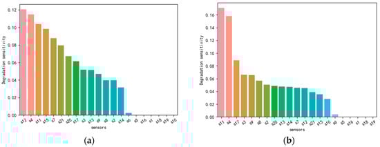 In addition, by calculating the cumulative reduction of Gini coefficient of the ExtraTreesClassifier, the degradation sensitivity of 21 sensors could be obtained. As shown in Figure 11, the y axis represents the value of degradation sensitivity of different parameters. The more sensitive, the greater the value. There were six parameters that were zero. The reason is that these six parameters are constant throughout the whole life cycle in FD001, as shown in Table 2. These insensitive features not only can not improve the prediction accuracy of the algorithm, but also increase the need for computation and training time. Hence, the irrelevant parameters were deleted from the raw datasets. As shown in Figure 11a, s1, s5, s10, s16, s18 and s19 were deleted in FD001. In FD003, s1, s5, s16, s18 and s19 were deleted.