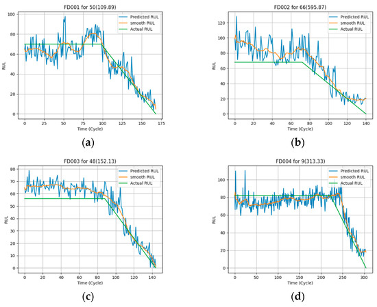 To observe the prediction effect of the proposed algorithm, four engines wer randomly selected from FD001 to FD004, respectively. The RUL of the whole running cycle was predicted, and the outcomes were smoothed by the exponential smoothing. The final results of these four engines are shown in Figure 12. It can be seen that the proposed algorithm can meet the expectations to realize the prediction of the RUL.