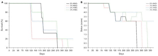 Survival (A) and status scores (B) of mice in groups with different KNO3 concentrations.