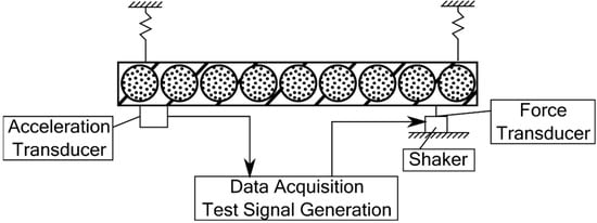 Gagnon et al. summarised the methods for simulating and measuring the dynamic impact of powder-based dampers [7]. In their study, they showed the differences in measured outer geometries, and analysed frequencies for transient excitation and the used powder/particle size and classes of material. Most of the mentioned studies employed a transient excitation of a beam and the effect of the excitation was measured with accelerometers. The study by Xu et al. [8], as an example of this measurement setup, used a shaker and accelerometer to analyse the damping capacity. The measurement setup is shown in Figure 2.