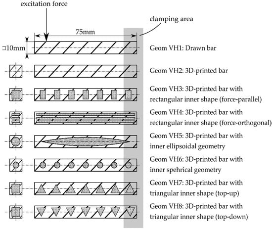 When comparing the inner structures of the shown geometries under consideration of the presence of sharp edges, the samples can be sequenced as: “Geom VH6” has no sharp edge in any direction because it is a spherical geometry, while “Geom VH3, 4, 7 and 8” have different edge lengths in relation to the force direction. These different lengths were considered as impedance elements affecting the dynamical behaviour. Therefore, the length of impedance elements was systematically modified.