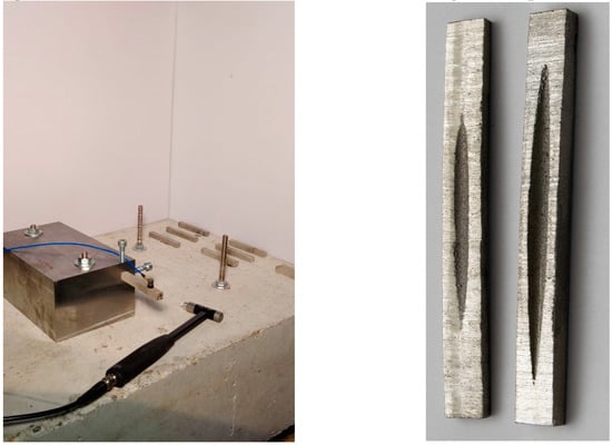 An oscillation test was performed to analyse the damping capability for this approach. The measurement setup is shown in Figure 4. For this purpose, a number of specimens per each measurement series were clamped into a sample holder. With an impulse hammer, a Dirac impulse was then induced to start a free oscillation. When comparing the investigated structures with the structures in Figure 4, it can easily be seen that the geometries “Geom VH3-8” in Figure 5 comply with particle damper (c) and the multi-unit particle damper (d). “Geom VH1” and “Geom VH2” were used as reference for the evaluation.