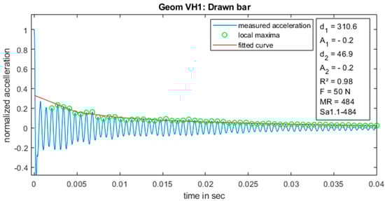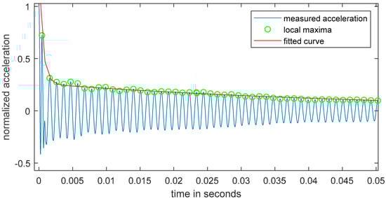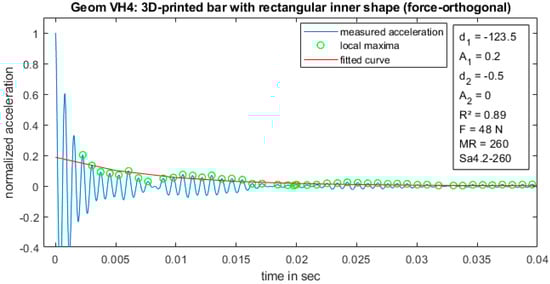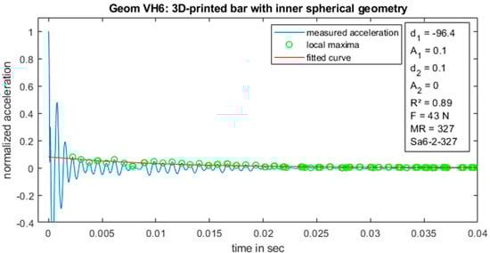 Figure 7 shows the general procedure for the evaluation process of the measured acceleration data. The green-marked high points of acceleration are the database for the fitted curve. The figure shows a sample which is printed but has no inner geometry. For the data shown, the coefficient of determination is 91%. The fitted function was calculated by the four parameters mentioned in Equation (2). Using those four parameters, the damping capacity of the measurements could be compared.