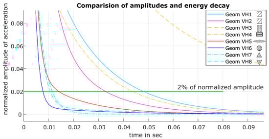 When considering the curves shown in Figure 11, it can be seen that the decrease in acceleration amplitude is closely related to the two geometric variables “surface area of the inner geometry” and “shape and number of cavities”. The shape of the geometry must also be interpreted here in terms of the number of geometric edges, which influence the damping of the system to a considerable extent. This dependency becomes clear when comparing the geometries “Geom VH4” and “Geom VH6”: the spherical geometry has no inner edges, and thus has a very good volume-to-surface-to-cavity ratio. The cuboid geometries in “Geom VH4” have numerous edges and an unfavourable volume-to-surface ratio. In direct comparison with the triangular geometries from “Geom VH7” and “Geom VH8”, it is clear that when the ratio is improved, the energy decrease is stronger, and the amplitude is faster in the band below 2% of the starting amplitude, cf. t2% in Table 2.