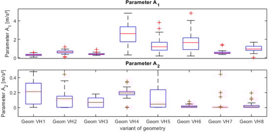 For the first statistical classification and evaluation, the derived parameters for all generated measurements were collected and analysed using the boxplot graphics shown in Figure 12. From this graphic, it is possible to obtain a first overview of the scattering of parameters, and this helps in comparing the geometry variants. The plot shows that the scattering of parameters A1 and A2 is connected with the geometry variants and seems not to be bonded to a specific shape of inner geometry. A possible reason for this is an external dynamical interspersion in the measurement setup while measuring variants VH4 to VH6. The influence cannot be seen in the evaluation of parameter A2, which has a lower influence on the decay curve than parameter A1.