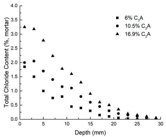 The C3A phase plays an important role in chloride binding. Sulphate-resisting Portland cements (Type V cements according to ASTM or CEM 1-SR in EN 197-1) have lower C3A contents so as to inhibit expansive ettringite formation. Thus, these cements have lower chloride binding capacities and, thus, allow for greater free chloride penetration for a given permeability than ASTM Type I cements [45,46]. Hussain [47] observed that an increase in the C3A content from 2.43 to 14% resulted in approximate 2.65- and 2.85-fold increases in the chloride binding capacity and chloride threshold, respectively. Meanwhile, Rasheeduzzafar [48] reported that Type I cements with C3A contents of 9.5%, bound about 1.6-times more chloride than those with C3A contents of 2.8%. Therefore, while increasing C3A contents do increase chloride binding, other factors are also an influence. In a study by Kim et al. [49], an increased C3A content resulted in increased chloride ingress at every depth (Figure 1), presumably implying that increased chloride binding capacity may accelerate the rate of chloride transport at a given exposure condition. This phenomenon can be attributed to the chemical balance of chlorides in the vicinity of the interfacial region between concrete and water-based media (salt solution). As the higher C3A content imposes the increased binding of chloride ions on the surface of concrete, more chlorides percolate to meet the equilibrium of the chloride gradient. Thus, the mobility of chlorides would increase with the chloride binding capacity so that more free chlorides could be accumulated on the surface of concrete, thereby substantially increasing both the free and bound chlorides.